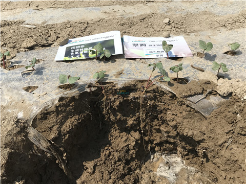 隨后,就在棉花剛出苗時(shí)葉子都被打爛的情況下,使用了在新疆石河子當(dāng)?shù)貐^(qū)一款爆品“安碧解”進(jìn)行預(yù)防改善,使用3-5天后,棉花葉片明顯不一樣了,顏色逐漸恢復(fù)正常,真葉展開(kāi)得非常平坦,不存在弱苗或長(zhǎng)勢(shì)過(guò)旺現(xiàn)象,整體表現(xiàn)非常好。